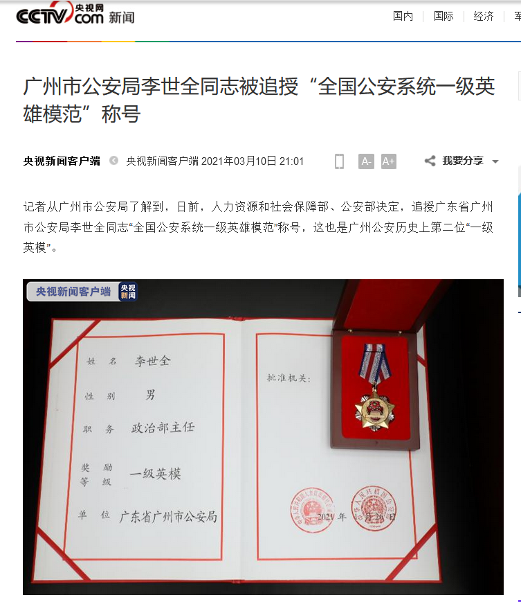 日前,人力资源和社会保障部、公安部决定,追授我院1986级档案学专业校友、广州市公安局政治部原主任李世全同志“全国公安系统一级英雄模范”称号,这也是广州公安历史上第二位“一级英模”。