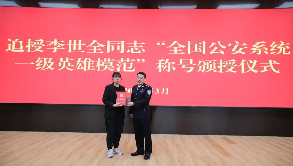 3月10日上午,广州市公安局举行“全国公安系统一级英雄模范”称号颁授仪式,向李世全同志致以崇高敬意。广州市副市长、市公安局局长孙太平为李世全的女儿颁发了“一级英模”奖章、证书。