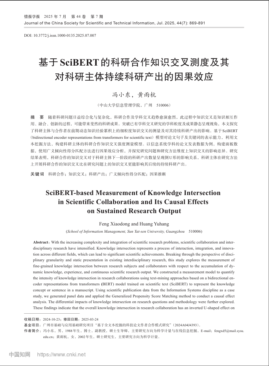我院冯小东副教授、黄雨杭硕士研究生撰写的论文《基于SciBERT的科研合作知识交叉测度及其对科研主体持续科研产出的因果效应》发表于《情报学报》2025年第07期。