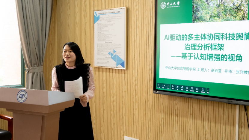 报告三由中山大学信息管理学院博士研究生高云芸主讲,题为《AI驱动的多主体协同科技舆情治理分析框架——基于认知增强的视角》。报告针对传统单向度治理模式的不足,提出了“人类价值理性主导、AI认知能力增强”的人机协同新范式。高云芸同学构建了包含监测预警、协同决策等维度的治理框架,认为AI驱动的多主体协同治理是科技舆情治理发展的必然趋势,为提升治理效能提供了新的理论视角。