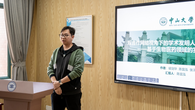 报告二由中山大学信息管理学院博士研究生陈宜泓主讲,题为《双合作网络视角下的学术发明人角色差异研究——基于生物医药领域的实证分析》。陈宜泓同学基于生物医药领域数据,构建“科学合作”与“专利合作”双网络模型。研究发现,学术发明人存在显著的“科学核心-专利边缘”角色失衡现象:他们在科学网络中是核心桥梁,但在专利网络中多处于边缘位置。这一发现深刻揭示了产学研知识转化中的结构性瓶颈。