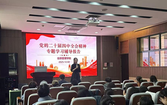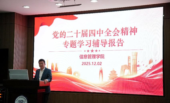 为全面深入学习领会党的二十届四中全会精神,按照学校党委的统一部署和工作要求,12月2日,信息管理学院在A108讲学厅举行深入学习党的二十届四中全会精神专题学习辅导报告会,邀请马克思主义学院助理教授滕飞主讲题为《学习贯彻党的二十届四中全会精神——承前启后,奋力开创中国式现代化建设新局面》的专题学习辅导报告。我院党委书记林俊洪、党委副书记吴曼瑜、党务秘书张学为和全院学生党员100余人参加。专题报告会由党委副书记吴曼瑜主持。